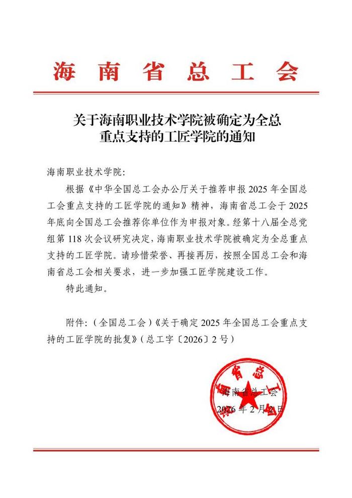 喜报!海职院被确定为全国总工会重点支持的工匠学院