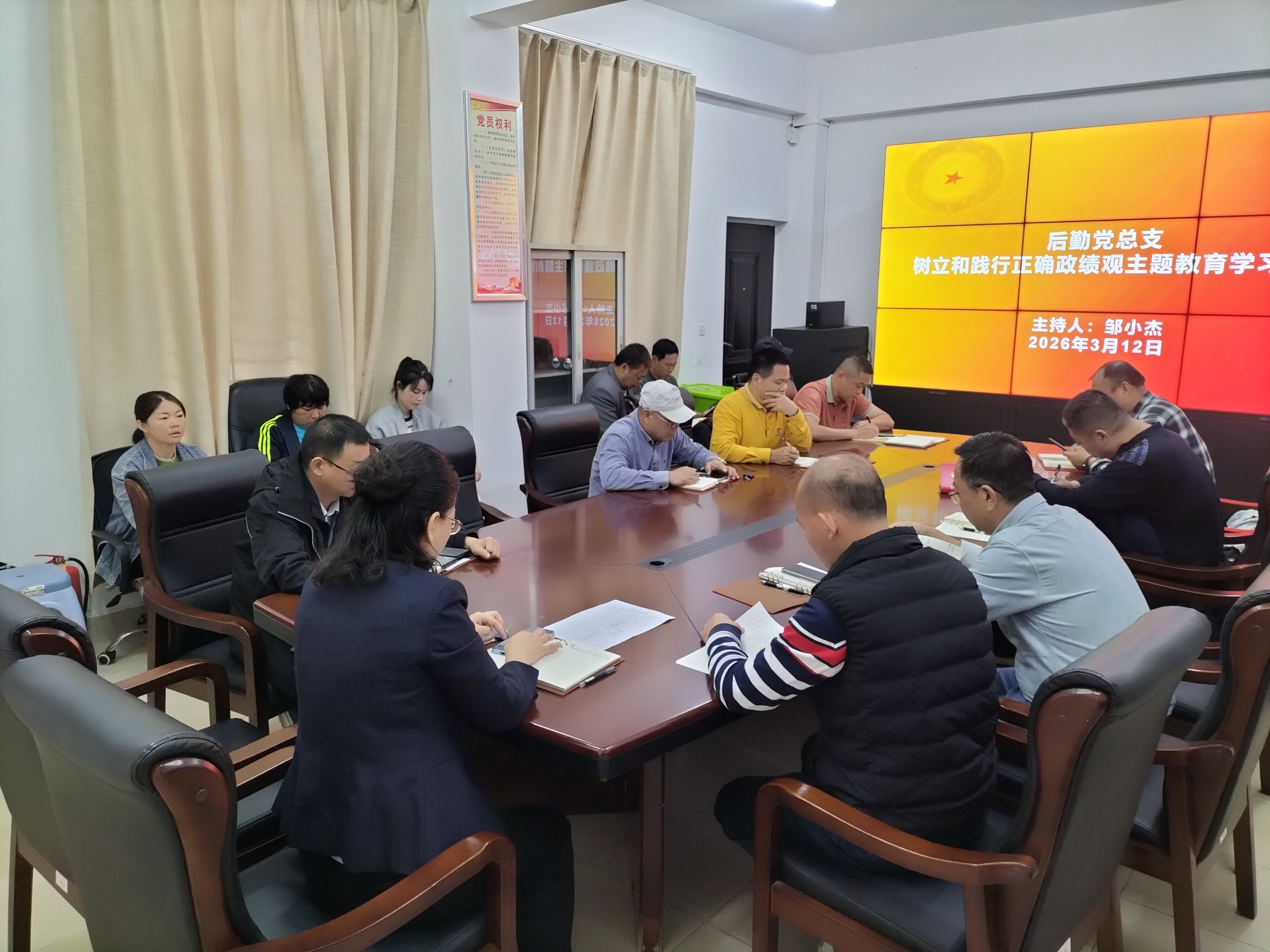 3月12日, 在后勤党总支书记邹小杰主持下,在行政楼109会议室召开以“树立和践行正确政绩观”为主题的理论学习会议,后勤党总支全体党员参加此次学习会议。