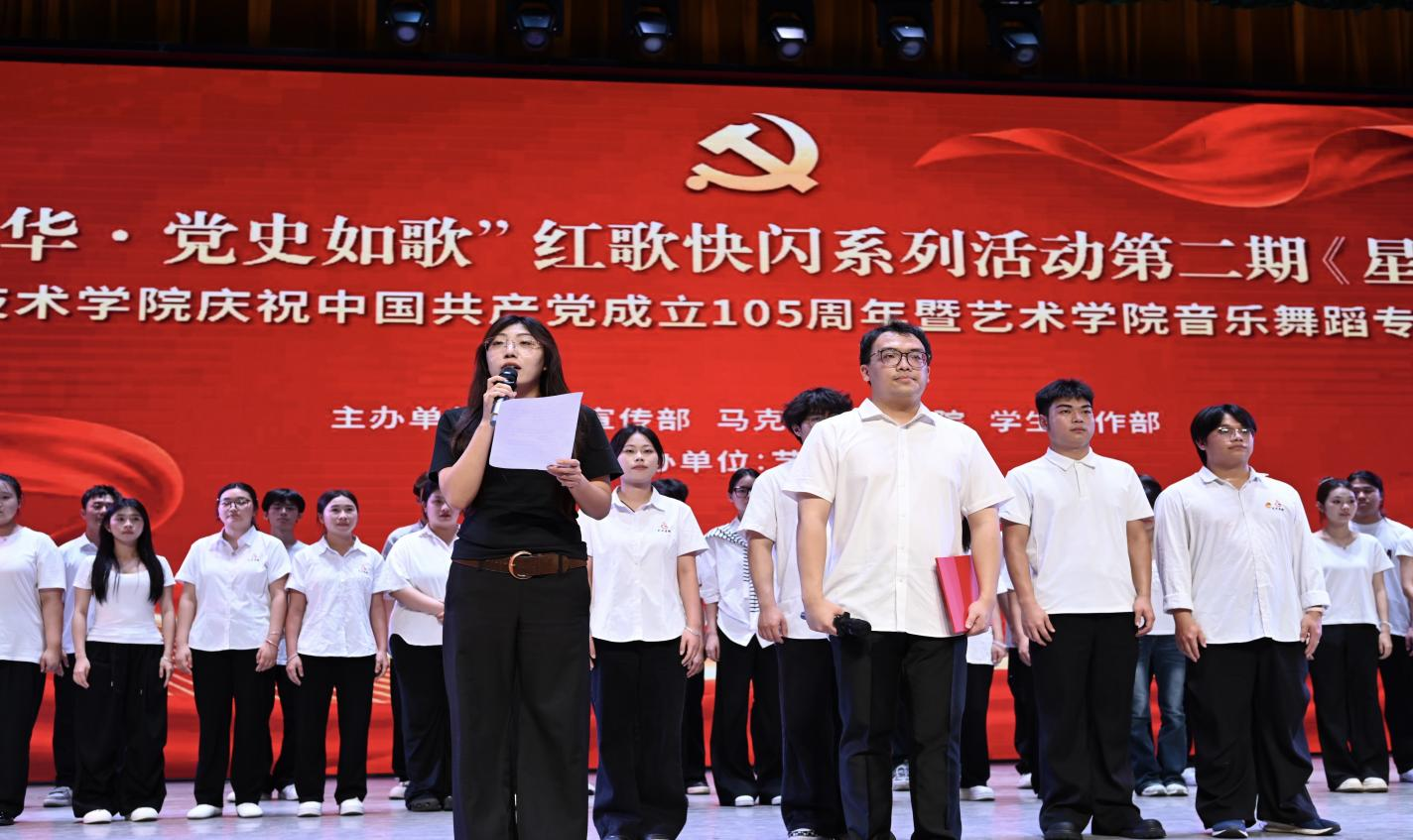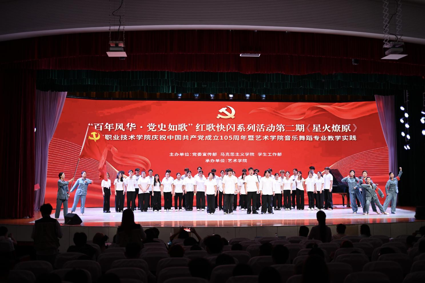 为庆祝中国共产党成立105周年,4月21日晚,海南职业技术学院“百年风华·党史如歌”暨艺术学院音乐舞蹈专业教学实践红歌快闪系列活动第二期《星火燎原》在学校大礼堂成功举办。快闪活动以艺术为媒传红色基因,以歌声为桥悟百年风华,让党史学习教育在沉浸式体验中入脑入心,致敬先辈用生命书写的信仰。