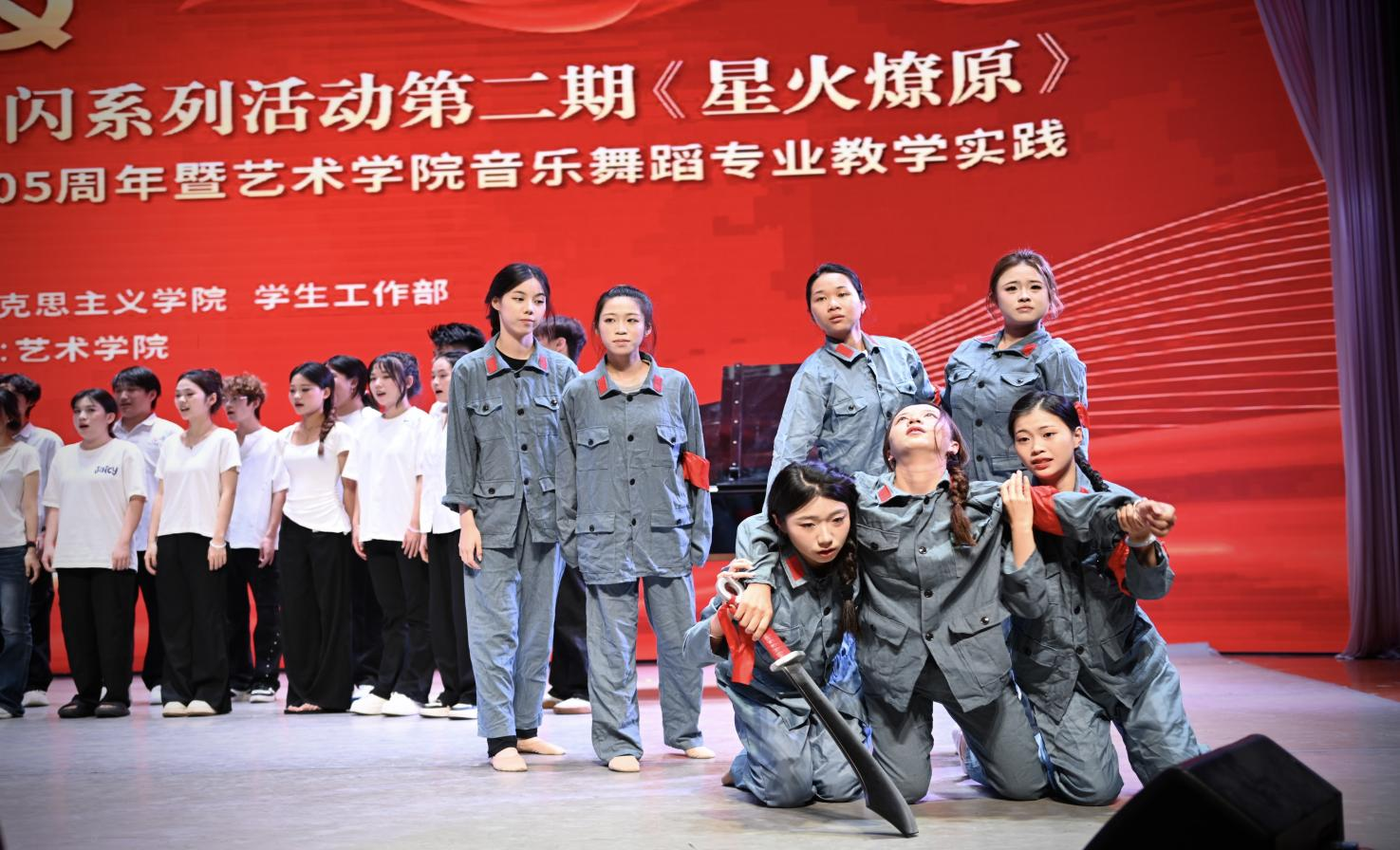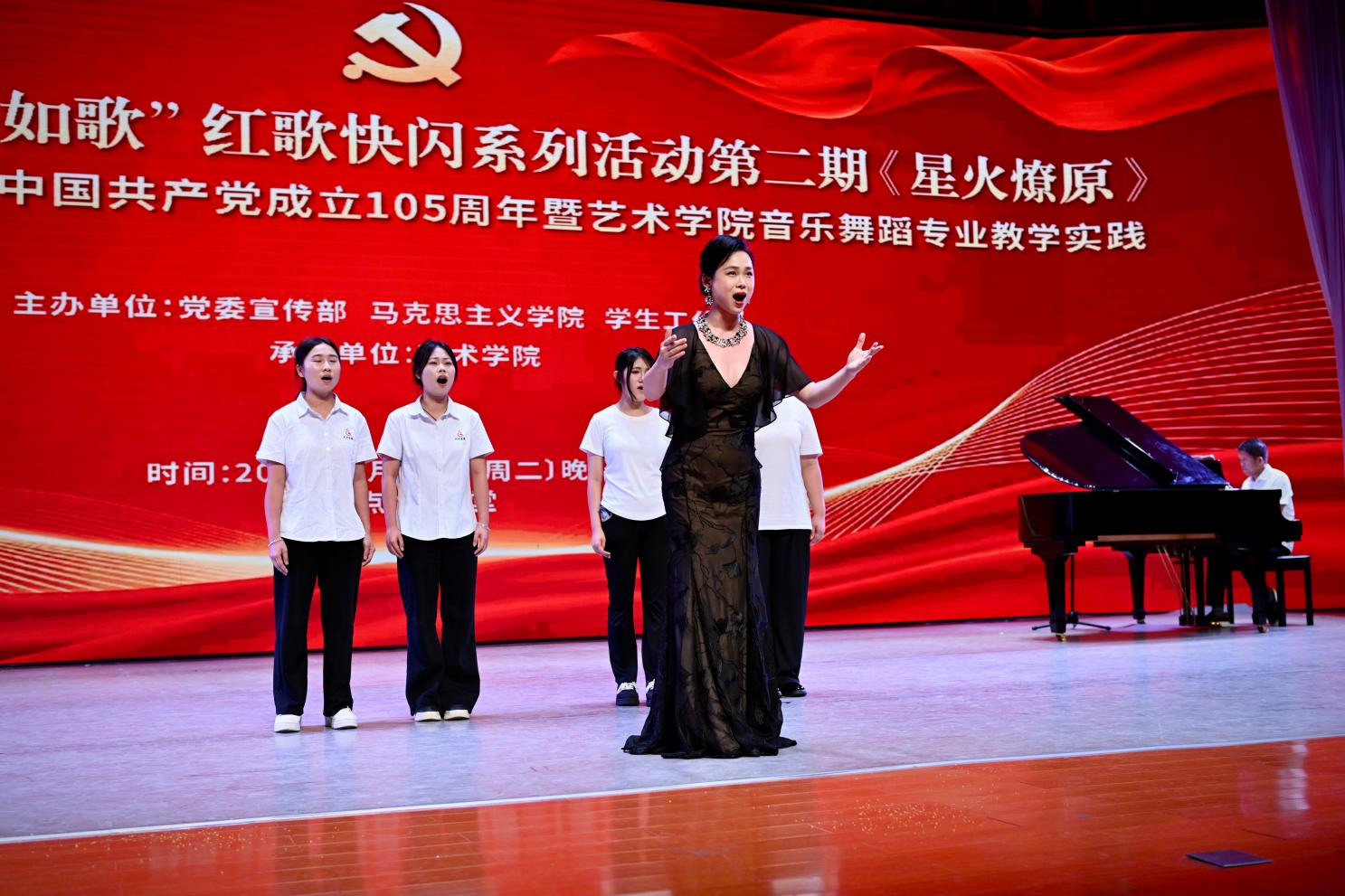 本次活动是由艺术学院牵头,联合党委宣传部、马克思主义学院、学生工作部共同策划实施,是艺术学院音乐表演与舞蹈表演两大专业首次以“党史学习教育”和“课程思政”为抓手,紧扣“中国共产党成立105周年”“红军长征胜利90周年”两大契机,牢牢把握“三个坚持”指导方针、发展新时代中国特色社会主义文化的探索与实践。两大专业全体教师从演出策划到实施,带领2024级音乐表演、舞蹈表演专业全体学生,以“项目化”教学的形式有序分工。在排练中教师现场展演、亲身示范,为学生开展教学指导,同时选拔优秀学员同台担任重要角色。