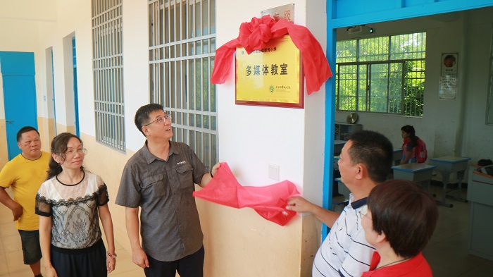 王安兴一行首先来到新园小学,在校长孙波的陪同下,先后参观了学校操场、学生休息区、多媒体教室等场所,并与孙波等深入交流。随后,王安兴、孙波、黄银珍、李琳娜共同为该校多媒体教室揭牌。