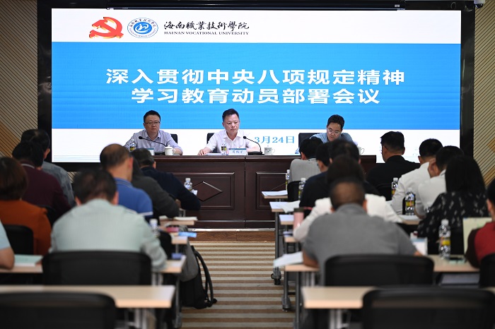 3月24日,我校党委召开深入贯彻中央八项规定精神学习教育部署会,深刻领悟习近平总书记关于深入贯彻中央八项规定精神学习教育的重要讲话和重要指示精神,传达学习中央党的建设工作领导小组会议和《中共中央办公厅关于在全党开展深入贯彻中央八项规定精神学习教育的通知》精神,贯彻落实省委常委会会议暨省委党的建设工作领导小组会议精神、海南省委教育工委会议精神,启动部署全校学习教育工作。校党委书记周炳才出席会议并讲话。校党委委员,校长助理沈振国主持会议。