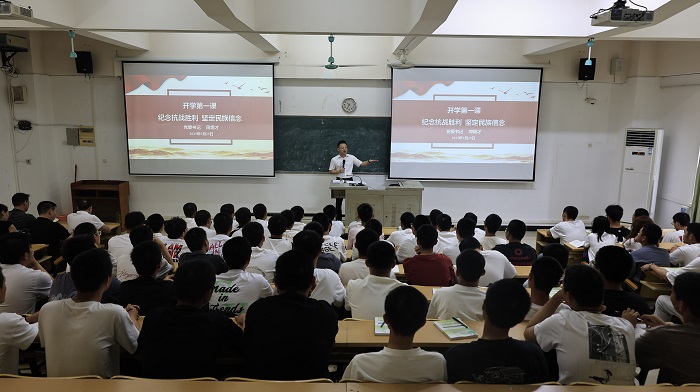 9月29日上午,学校党委书记周炳才以《纪念抗战胜利,坚定民族信念》为题,为25级新能源汽车1班、2班全体新生讲授了一堂生动的“开学第一课”。