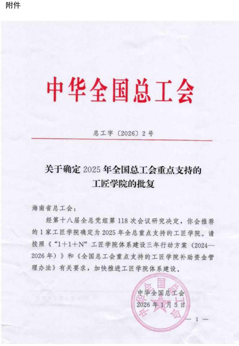 近日,中华全国总工会印发《关于确定2025年全国总工会重点支持的工匠学院的批复》,我校被确定为2025年中华全国总工会重点支持的工匠学院,此次入选标志着学校在深化产教融合、培养高素质技能人才方面的实践与成果获得了国家级认可。