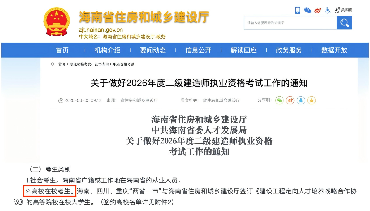 近日,海南省住房和城乡建设厅联合中共海南省委人才发展局正式发布《关于做好2026年度二级建造师执业资格考试工作的通知》。其中最引人注目的变化是首次允许高校在校学生报名参加考试。作为与海南省住建厅签订《建设工程定向人才培养战略合作协议》的高校之一,海职院建筑工程技术、工程造价、道路与桥梁工程技术专业的在校学生将享受这一政策红利,凭教育部学籍在线验证报告即可报考二级建造师,无需提供毕业证书和工作经历证明。这一政策打破了传统“从事建设工程项目施工管理工作满2年”的报考限制,真正实现了执业资格认证的前置化,为在校学生打通了“在校考试、毕业转正、来琼即用”的人才培养新通道。