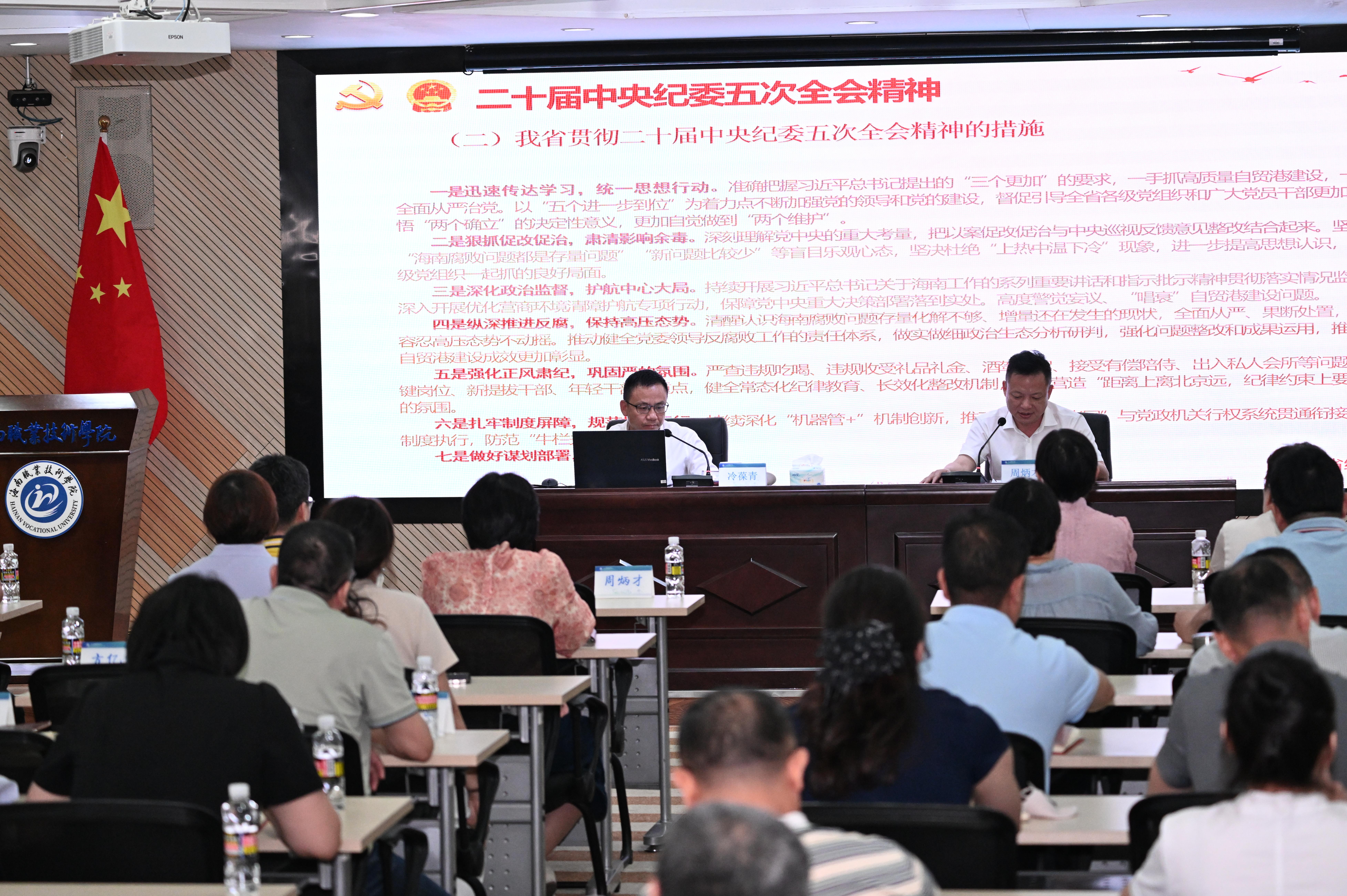 冷葆青以“以习近平新时代中国特色社会主义思想为指导,坚定建设清廉自贸港的信心和决心”为题,深入解读习近平总书记在二十届中央纪委五次全会上的重要讲话精神,结合全面从严治党新形势新任务和国内外热点案例,系统阐释“三个更加”重要要求,深刻阐明树立和践行正确政绩观的深刻内涵和实践路径。