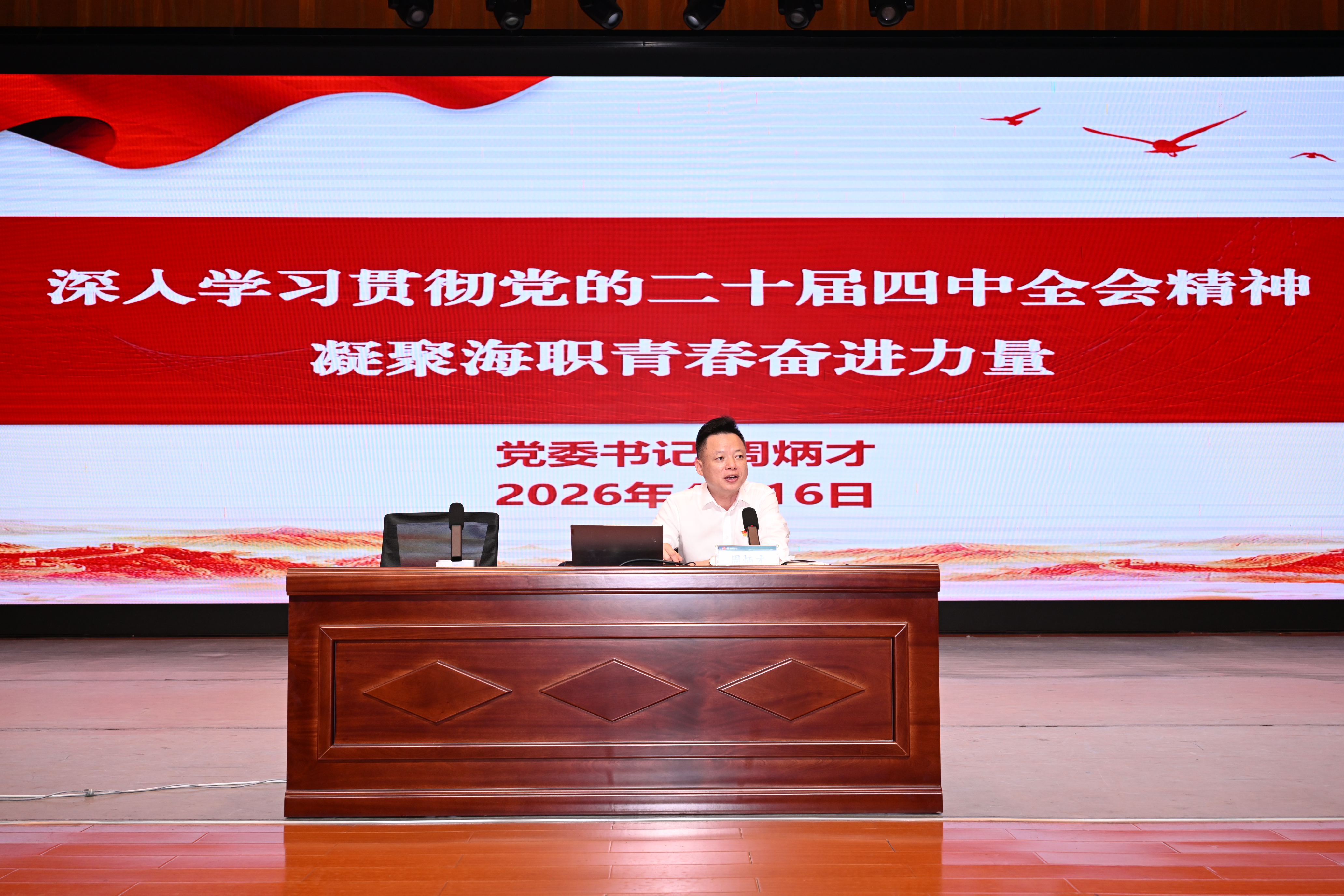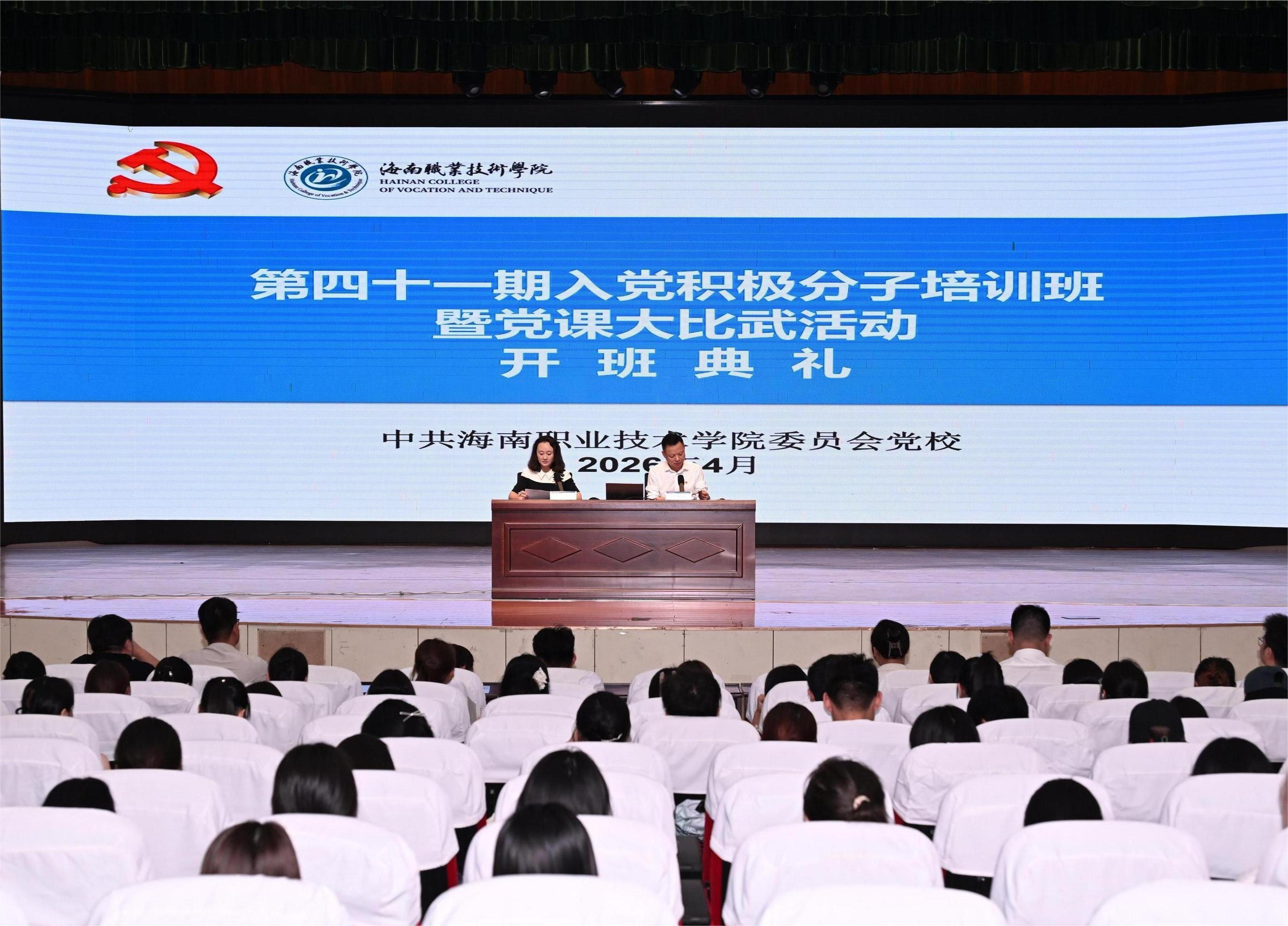 为深入学习贯彻党的二十届四中全会精神,加强入党积极分子教育培养,筑牢师生思想根基,4月16日,我校第四十一期入党积极分子培训班暨党课大比武活动开班典礼顺利举行。学校党委书记周炳才出席开班式并以“深入学习贯彻党的二十届四中全会精神 凝聚海职青春奋进力量”为题讲授专题思政课。440余名师生入党积极分子参加学习。