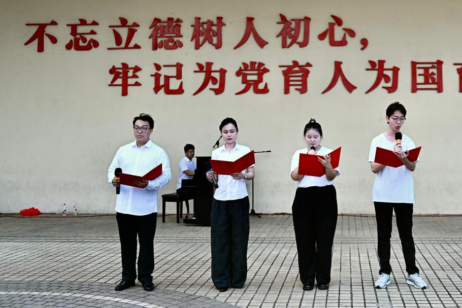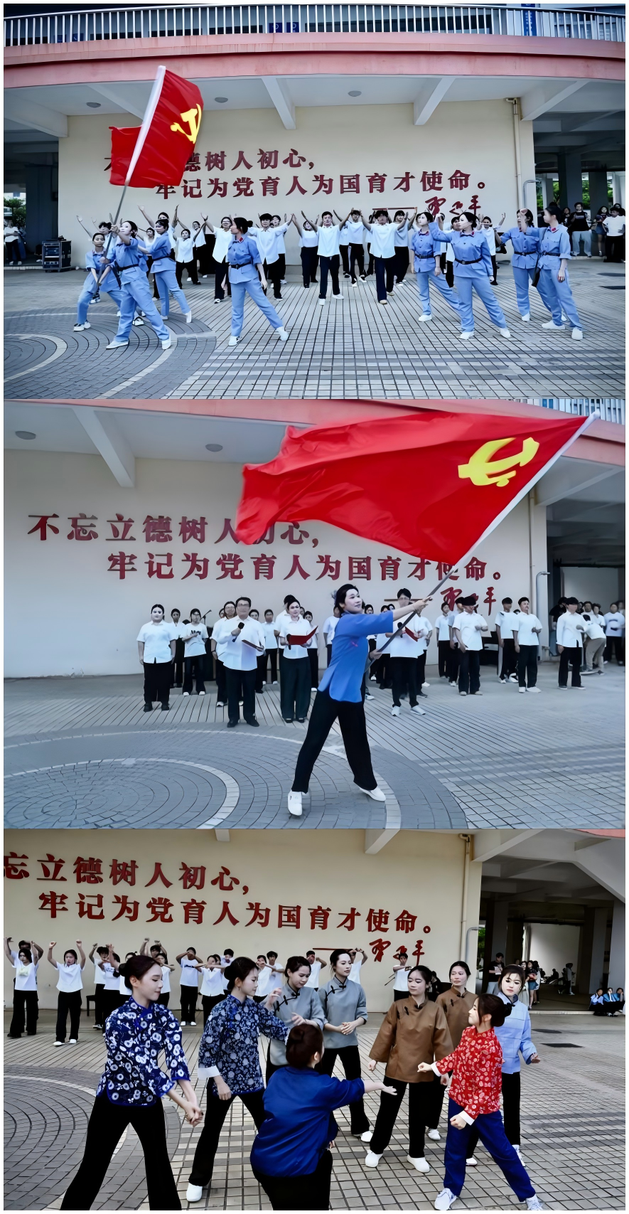 活动现场气氛热烈,高潮迭起。当《国际歌》的旋律响起,教学楼间穿梭的师生们纷纷驻足,循声聚拢,举起手机记录下这震撼一幕。参演学生以高亢嘹亮的歌声、刚劲有力的舞姿再现革命历史瞬间。演出结束后,现场学生反响热烈,2025级音乐班班长王润钰感慨道:“没想到党史还能这样学,听着这些歌,仿佛穿越回了那个热血年代,希望我们班也能参与进来。”不少学生纷纷表达期待,有的主动询问能否加入下一期的演出团队,红色信仰的种子在青年学子心中悄然扎根。