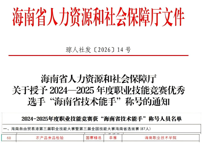 近日,海南省人力资源和社会保障厅、海南省教育厅印发《关于授予2024—2025年度职业技能竞赛优秀选手“海南省技术能手”称号的通知》,正式授予优秀选手该荣誉称号。其中,海职院热带农业技术学院教师李雅凭借突出的专业技能和优异的竞赛表现,成功入选,荣获“海南省技术能手”称号。