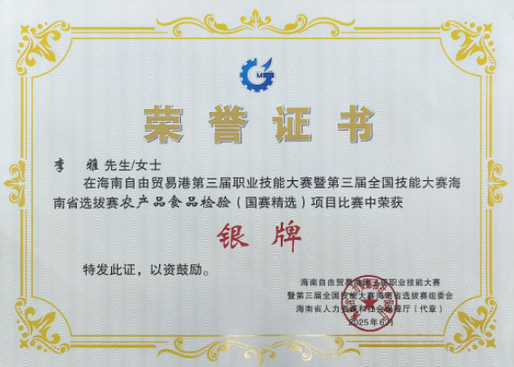 此前,在海南自由贸易港第三届职业技能大赛暨第三届全国技能大赛海南省选拔赛农产品食品检验赛项中,李雅奋勇争先、沉着比拼,凭借扎实的专业功底和娴熟的实操技能斩获银牌,为此次荣获“海南省技术能手”称号奠定了坚实基础。该荣誉的授予,既是对其专业能力的高度认可,也彰显了新时代职教教师的匠心与担当。